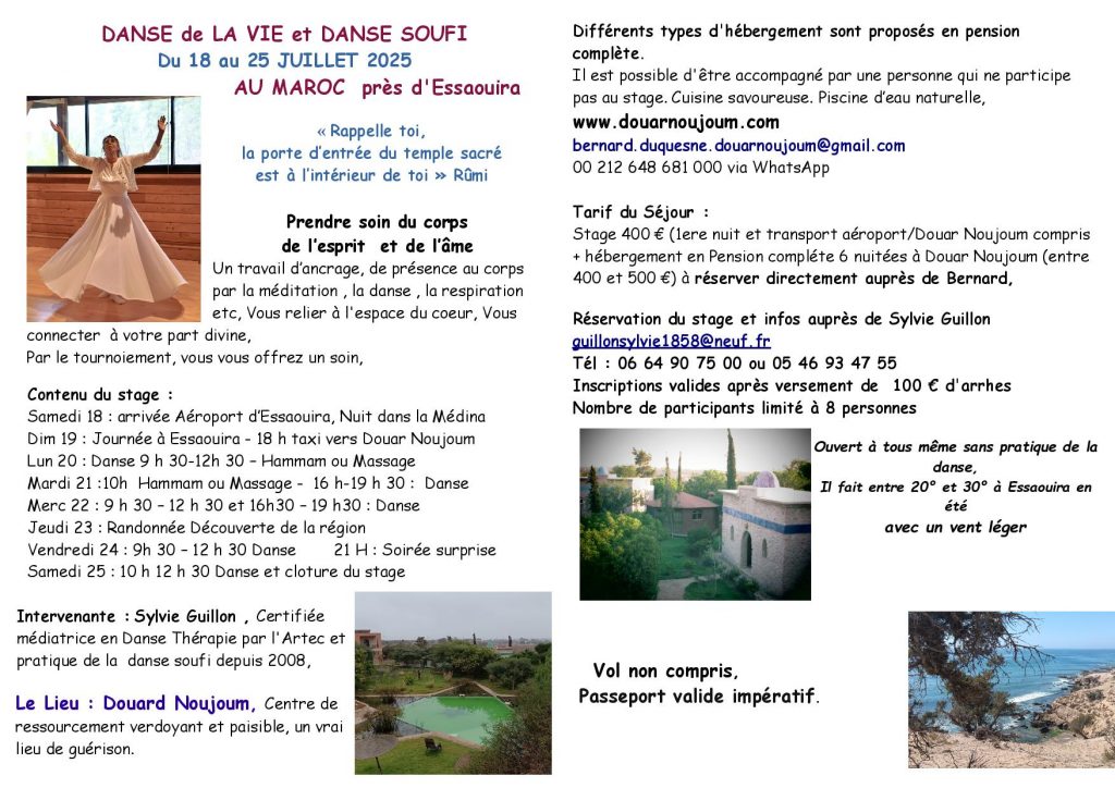 Je vous propose également de pratiquer des danses de cercle qui s’inscrivent dans le Soufisme populaire et qui m ‘ont été transmises par les confréries Aïssawa et Hamadcha du Maroc.